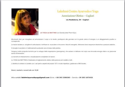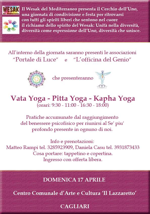 Vata Yoga - Pitta Yoga - Kapha Yoga (9.00-12.45;16.00-19.45) Yoga Vata/Pitta/Kapha, tre pratiche accumunate dal raggiungimento del benessere psicofisico per riunirsi al Se' piu' profondo presente in ognuno di noi. Info e prenotazioni: Matteo Rampi tel. 3285923909, Daniela Casu tel. 3931873433